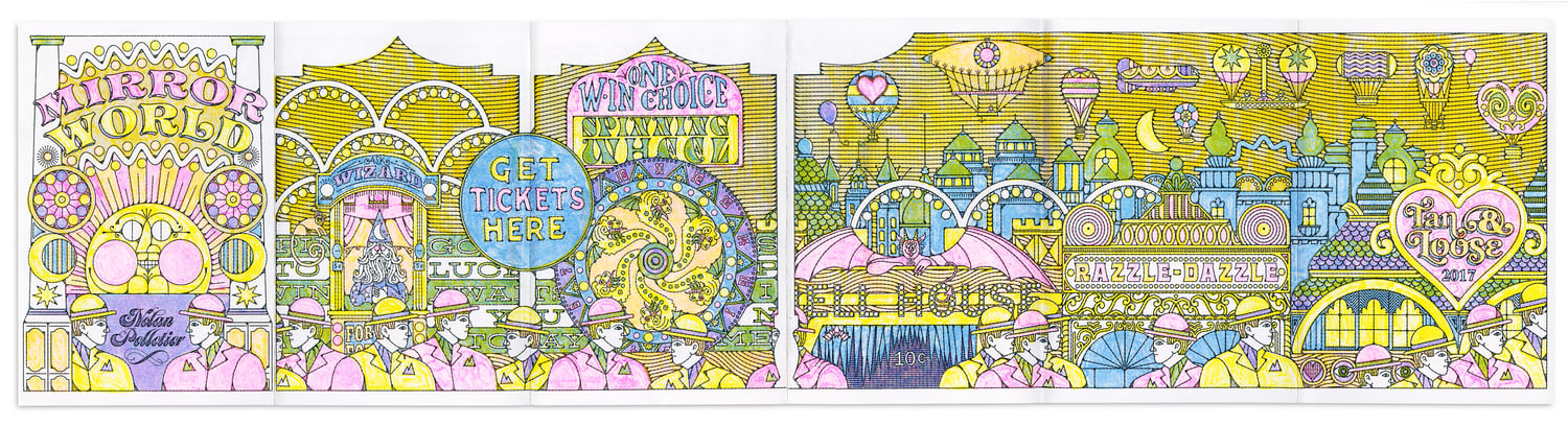 Take a trip through the mystical funhouse world of Nolan Pelletier. It's a psychedelic, multi-dimensional journey full of chimps, wizards and serpents. And it's an accordion book!